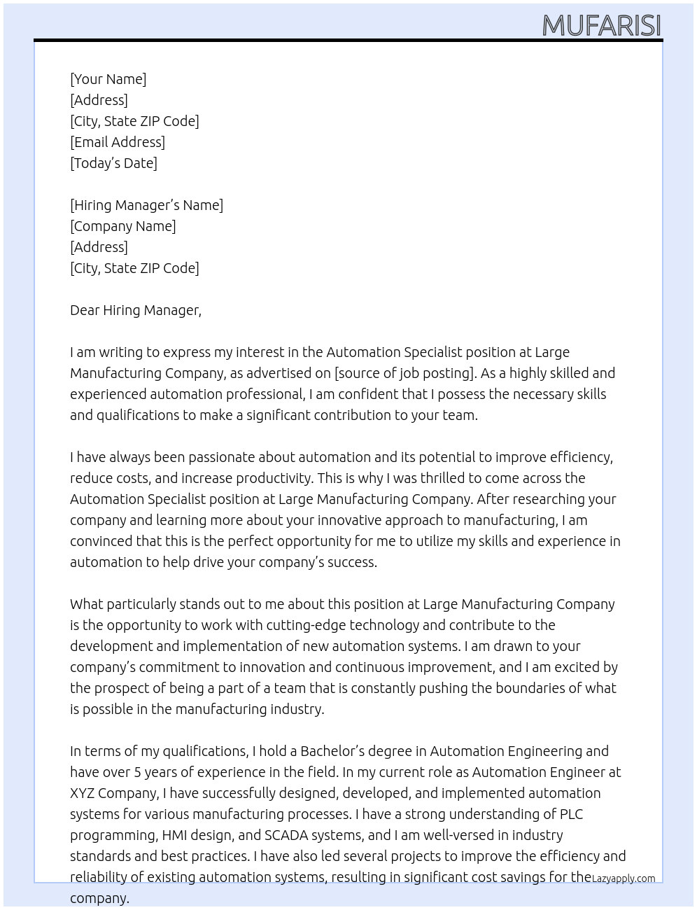 Automation Specialist Cover Letter At LARGE MANUFACTURING COMPANY