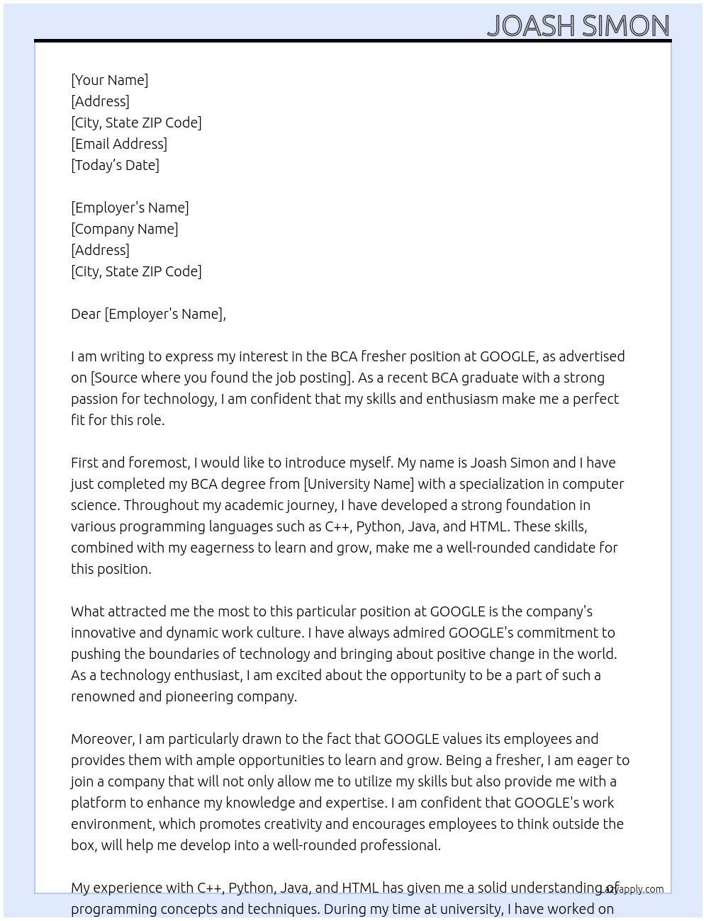 Check out these bca fresher cover letter sample and examples previously used by job seekers to land on job interviews as bca fresher. Use our AI cover letter generator to create a personalized cover letter as bca fresher.