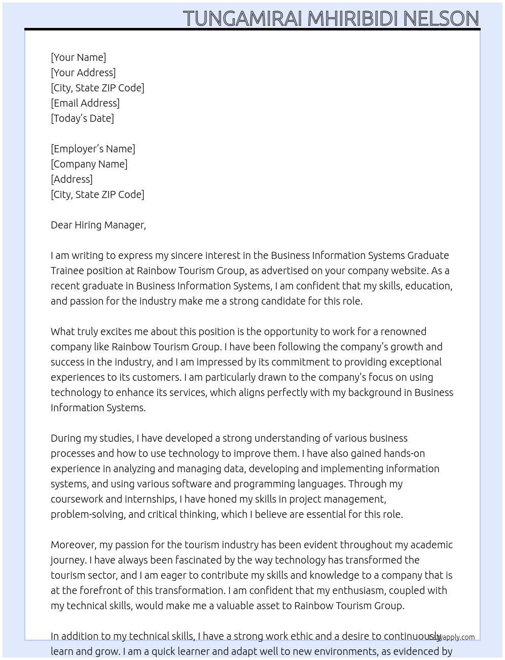 Business Information systems Graduate Trainee Cover Letter At Rainbow Tourism Group