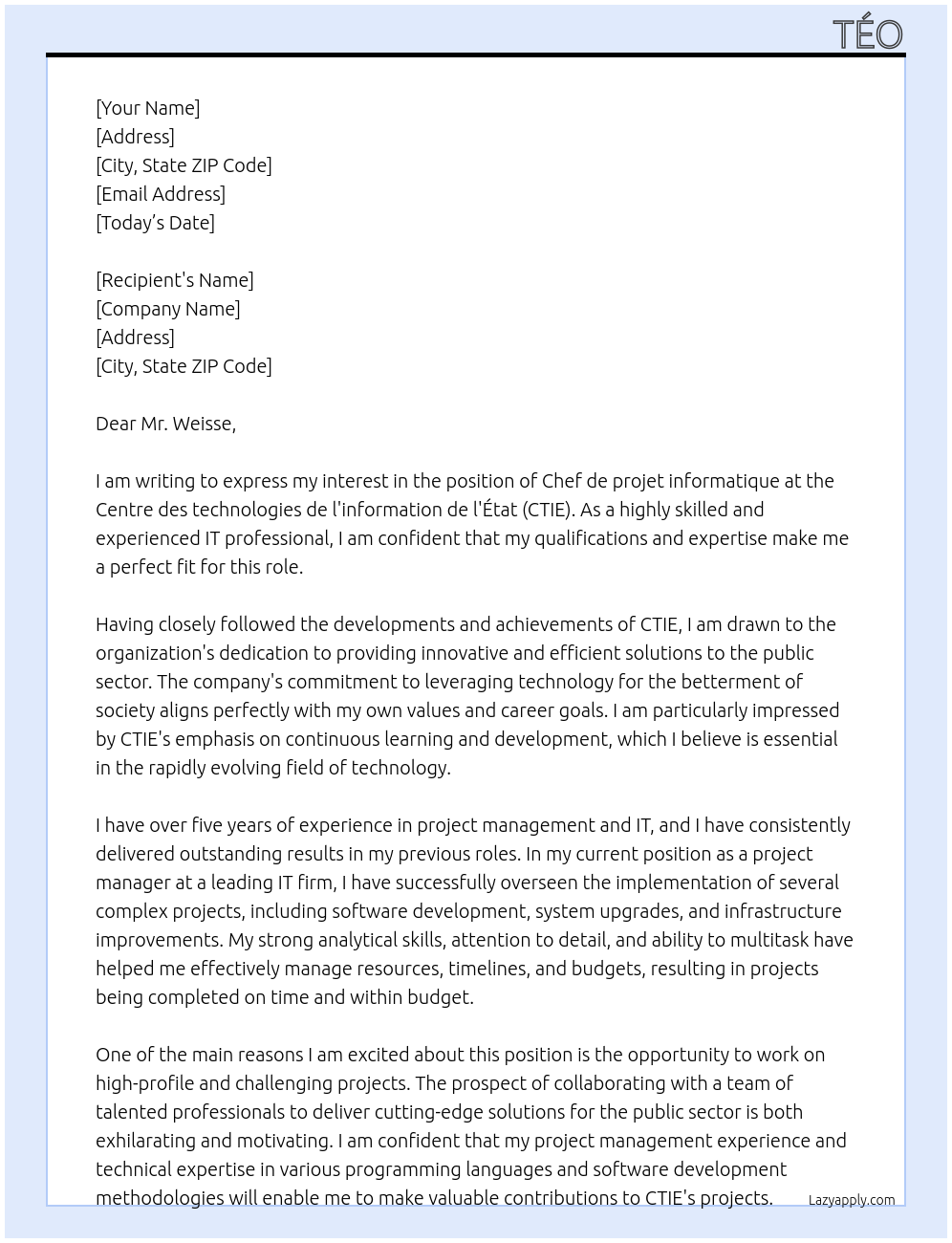 Chef de projet informatique Cover Letter At Centre des technologies de l'information de l'État (CTIE)
