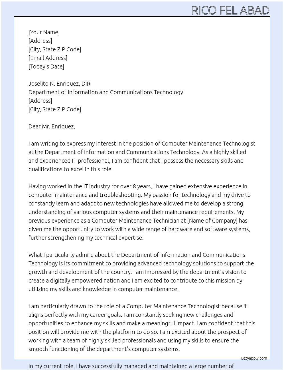 Computer Maintenance Technologist Cover Letter At Department of Information and Communications Technology