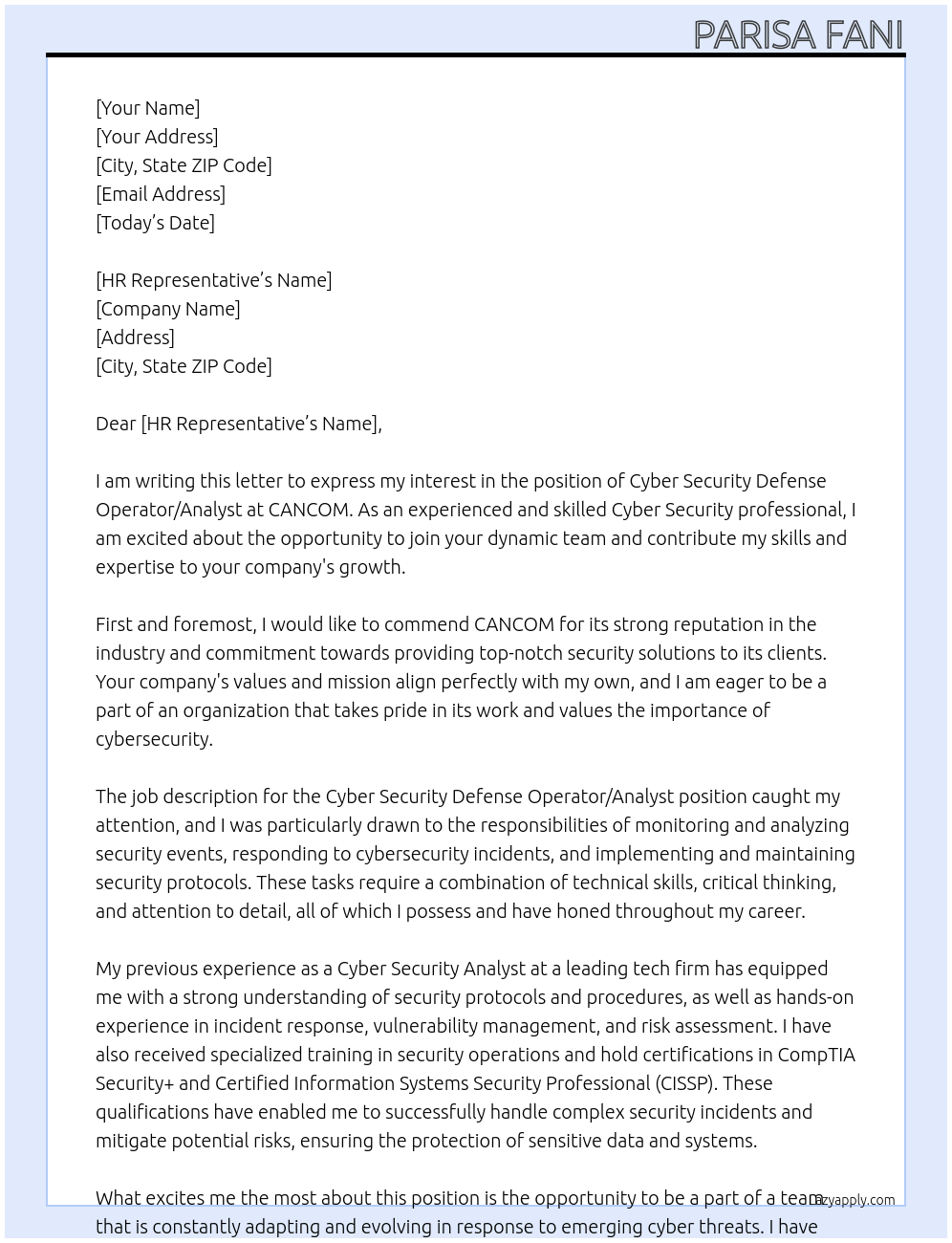 Cyber Security Defense Operator Or Analyst Cover Letter Examples And Template