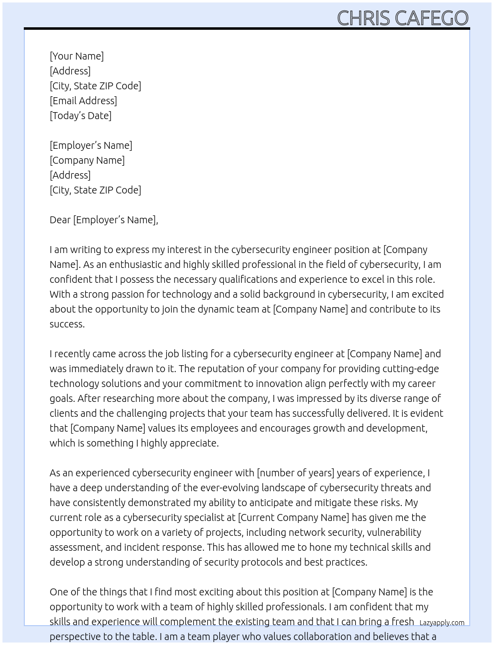 cybersecurity engineer Cover Letter At own project