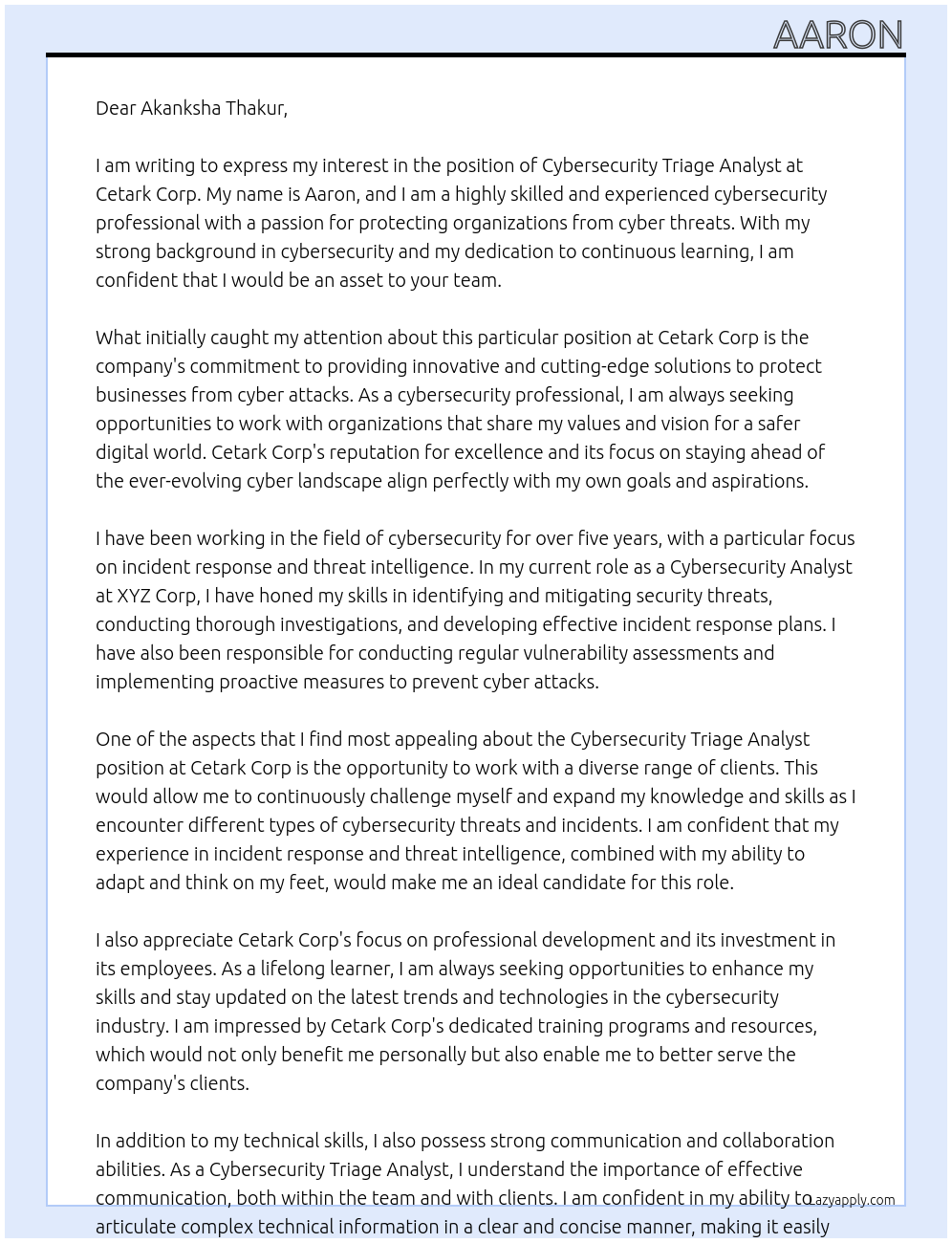 Cybersecurity Triage Analyst Cover Letter Examples And Template