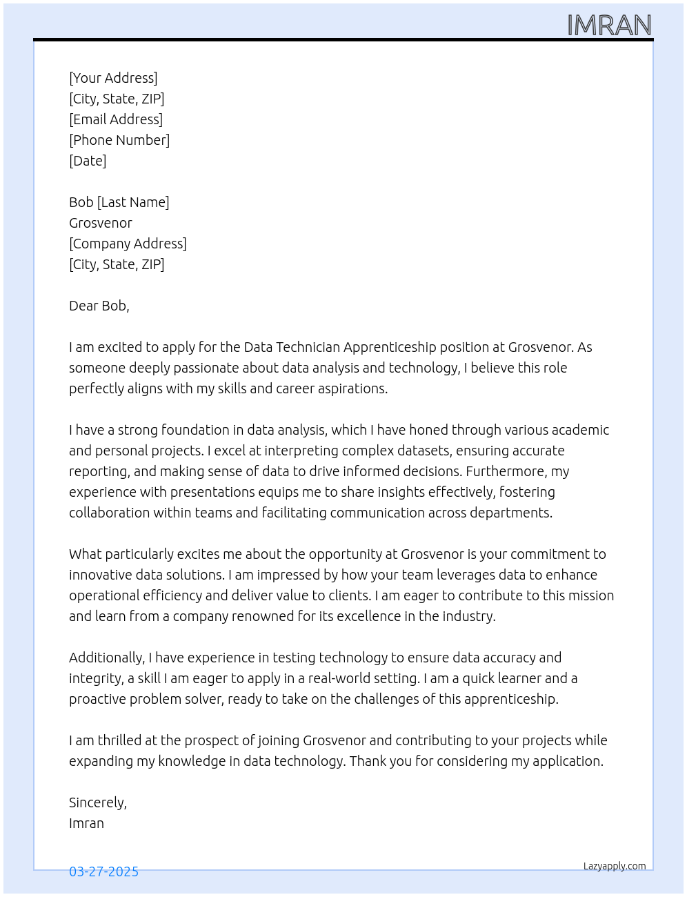 Check out these data technician cover letter sample and examples previously used by job seekers to land on job interviews as data technician. Use our AI cover letter generator to create a personalized cover letter as data technician.