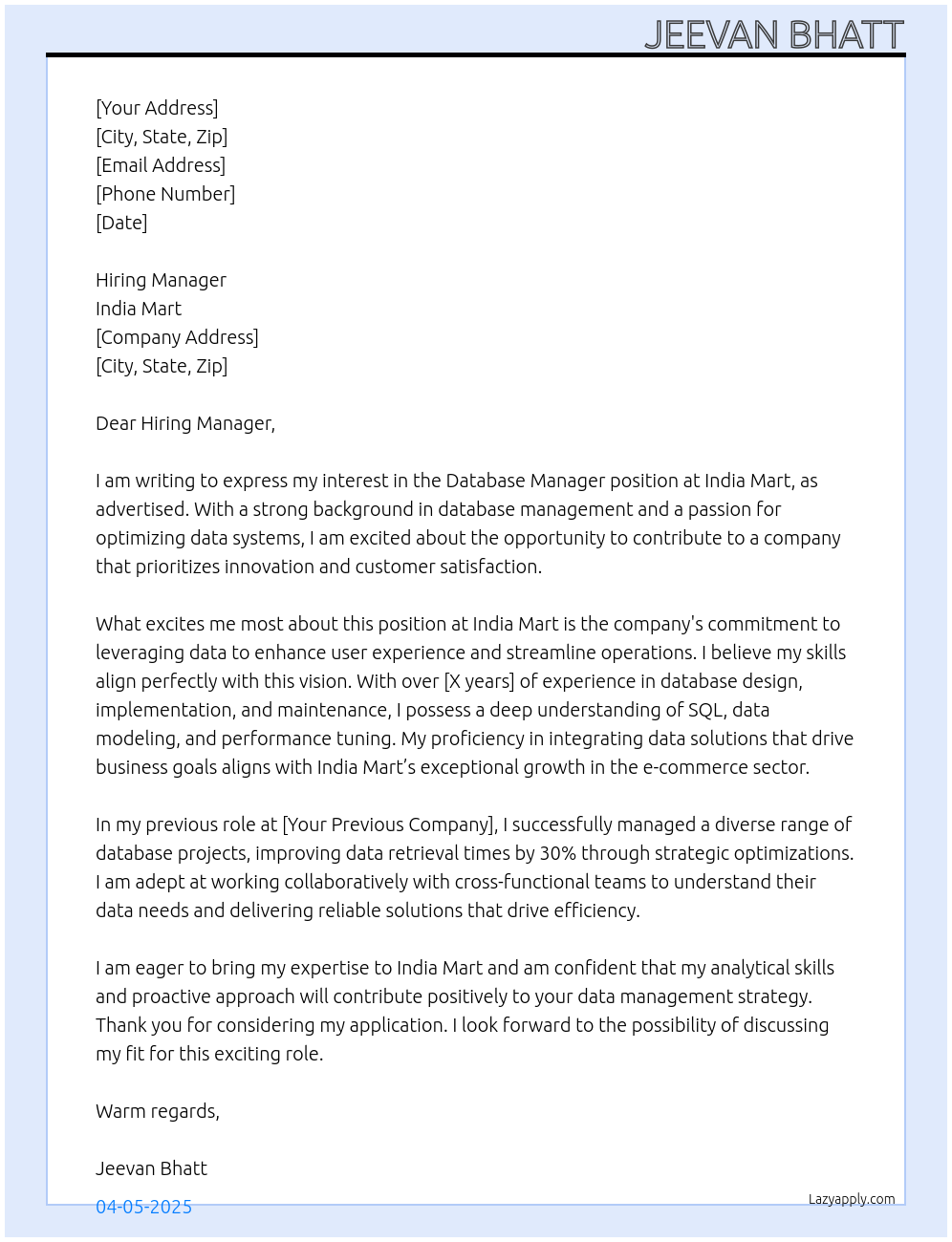 Check out these database mamager cover letter sample and examples previously used by job seekers to land on job interviews as database mamager. Use our AI cover letter generator to create a personalized cover letter as database mamager.