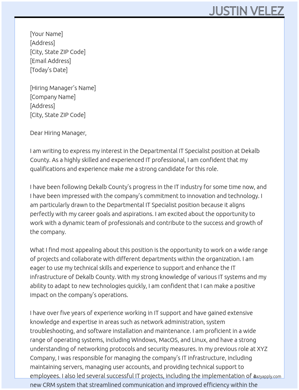 Check out these departmental it specialist cover letter sample and examples previously used by job seekers to land on job interviews as departmental it specialist. Use our AI cover letter generator to create a personalized cover letter as departmental it specialist.