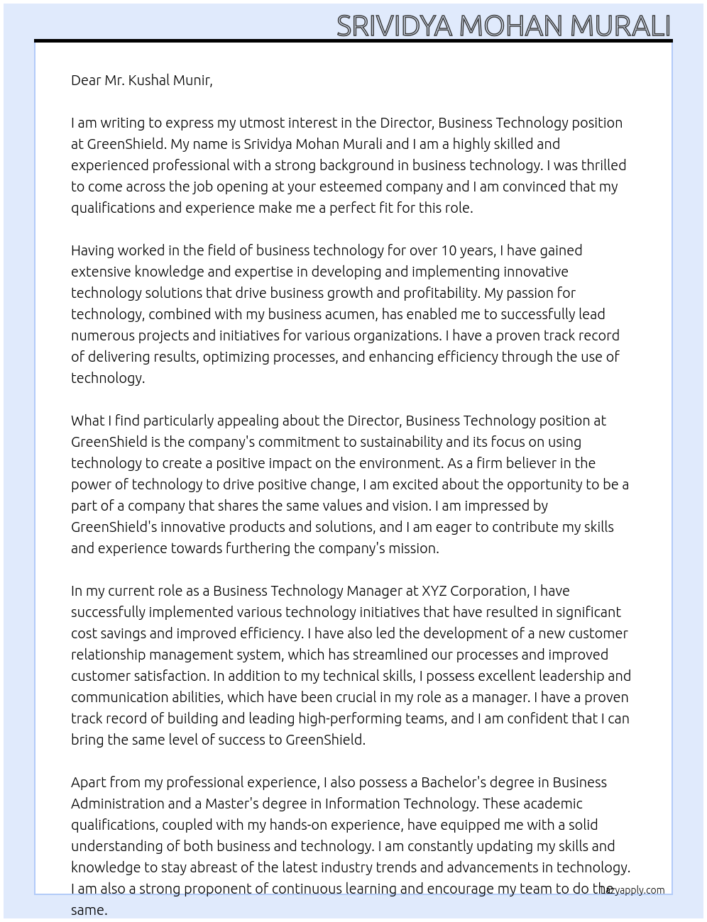 Check out these director, business technology cover letter sample and examples previously used by job seekers to land on job interviews as director, business technology. Use our AI cover letter generator to create a personalized cover letter as director, business technology.
