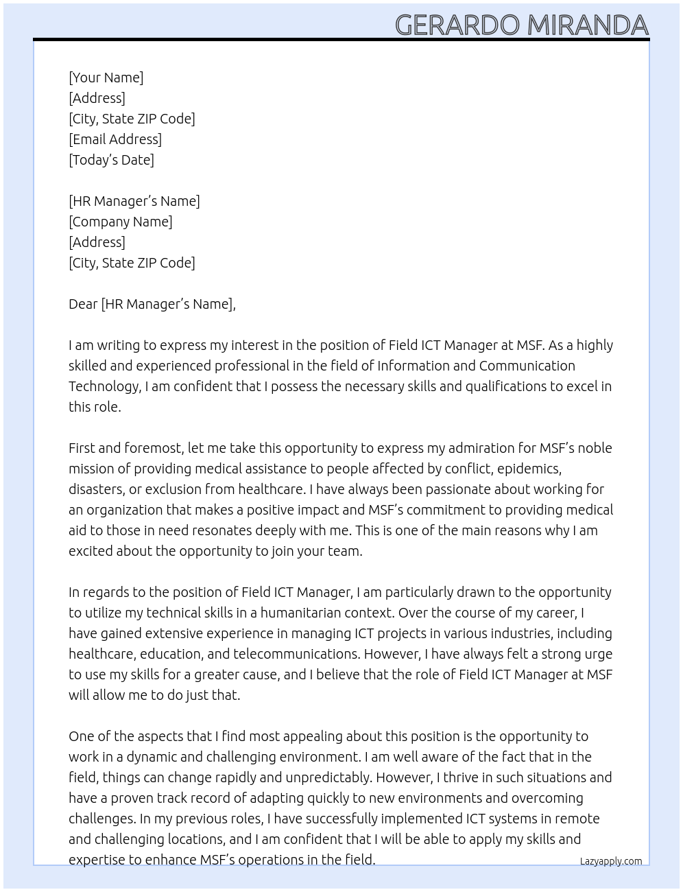 Check out these field ict manager cover letter sample and examples previously used by job seekers to land on job interviews as field ict manager. Use our AI cover letter generator to create a personalized cover letter as field ict manager.