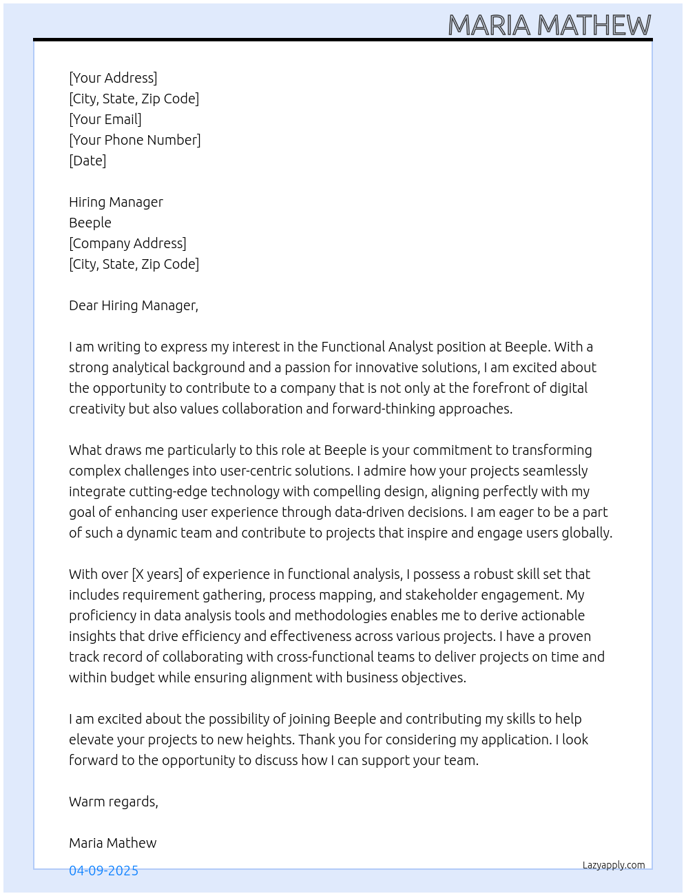 Check out these functional analyst cover letter sample and examples previously used by job seekers to land on job interviews as functional analyst. Use our AI cover letter generator to create a personalized cover letter as functional analyst.