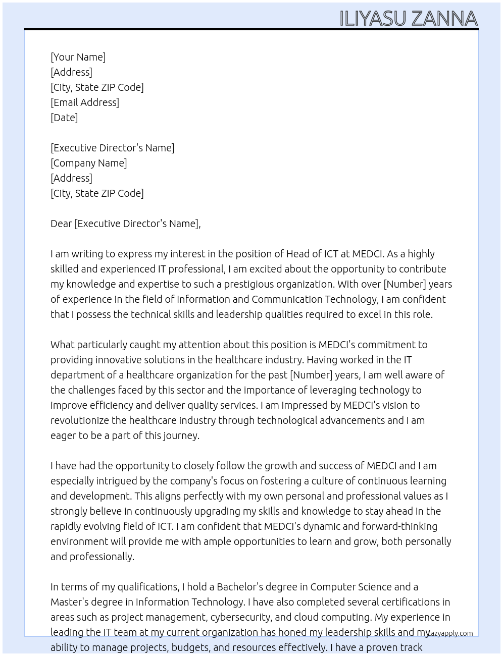 Check out these head of ict cover letter sample and examples previously used by job seekers to land on job interviews as head of ict. Use our AI cover letter generator to create a personalized cover letter as head of ict.