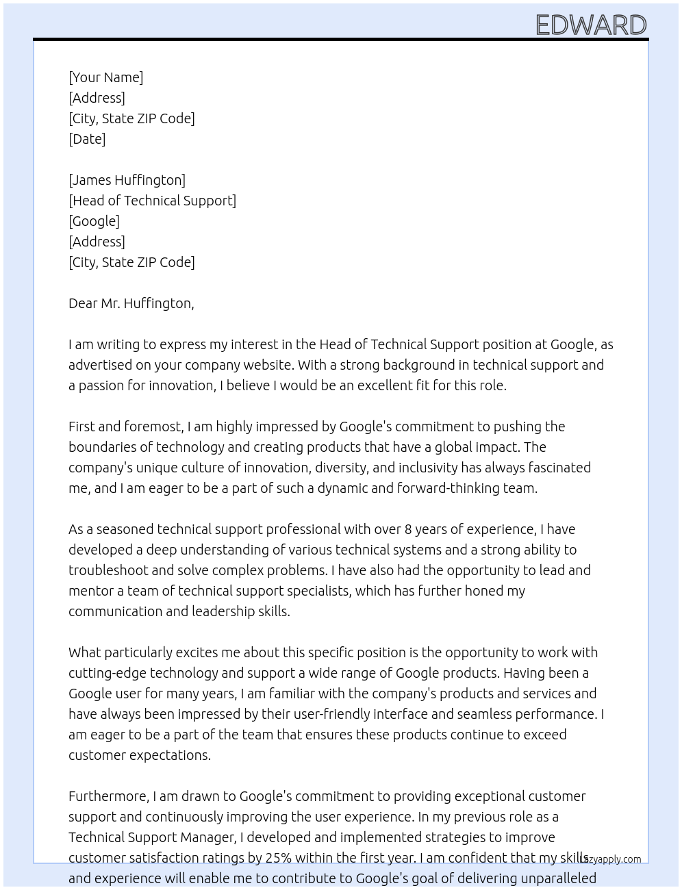Check out these head of technical support cover letter sample and examples previously used by job seekers to land on job interviews as head of technical support. Use our AI cover letter generator to create a personalized cover letter as head of technical support.