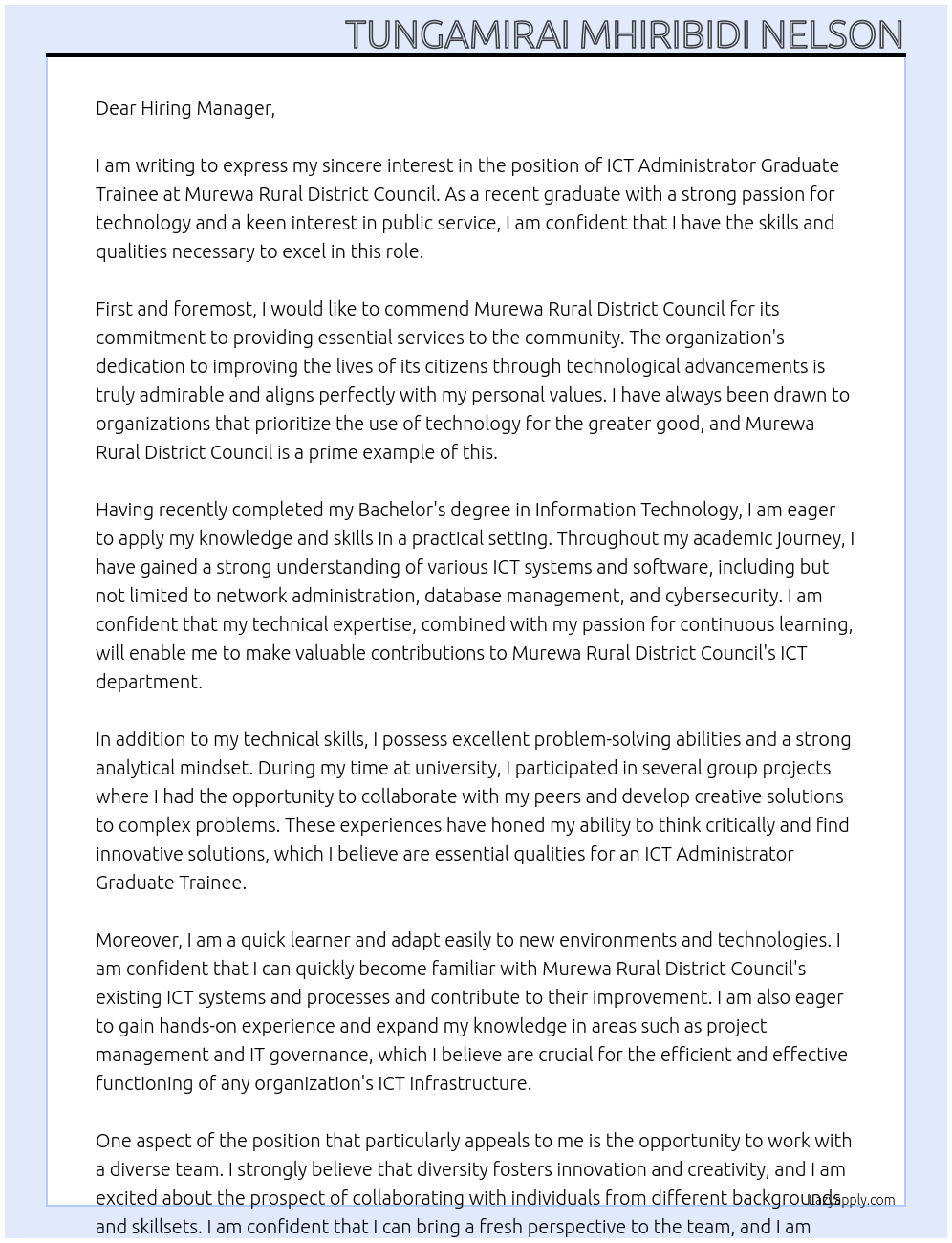 ICT Administrator Graduate Trainee Cover Letter At Murewa Rural District Council