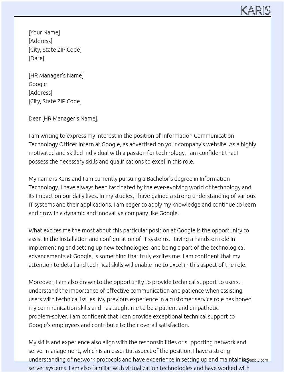 Information Communication Technology Officer Intern Cover Letter Examples And Template