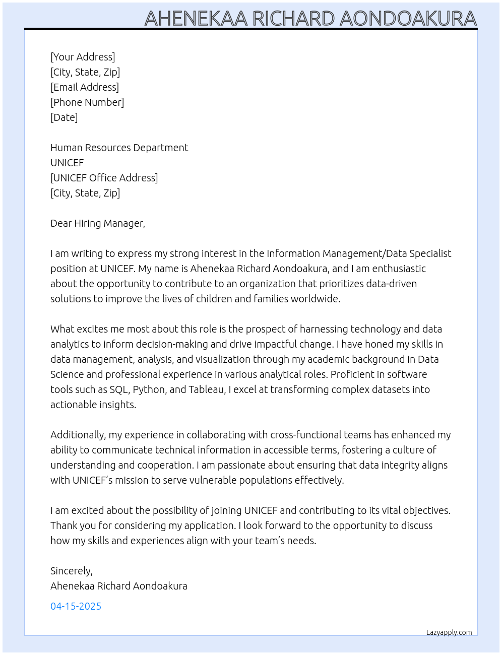 Check out these information management /data specialist cover letter sample and examples previously used by job seekers to land on job interviews as information management /data specialist. Use our AI cover letter generator to create a personalized cover letter as information management /data specialist.