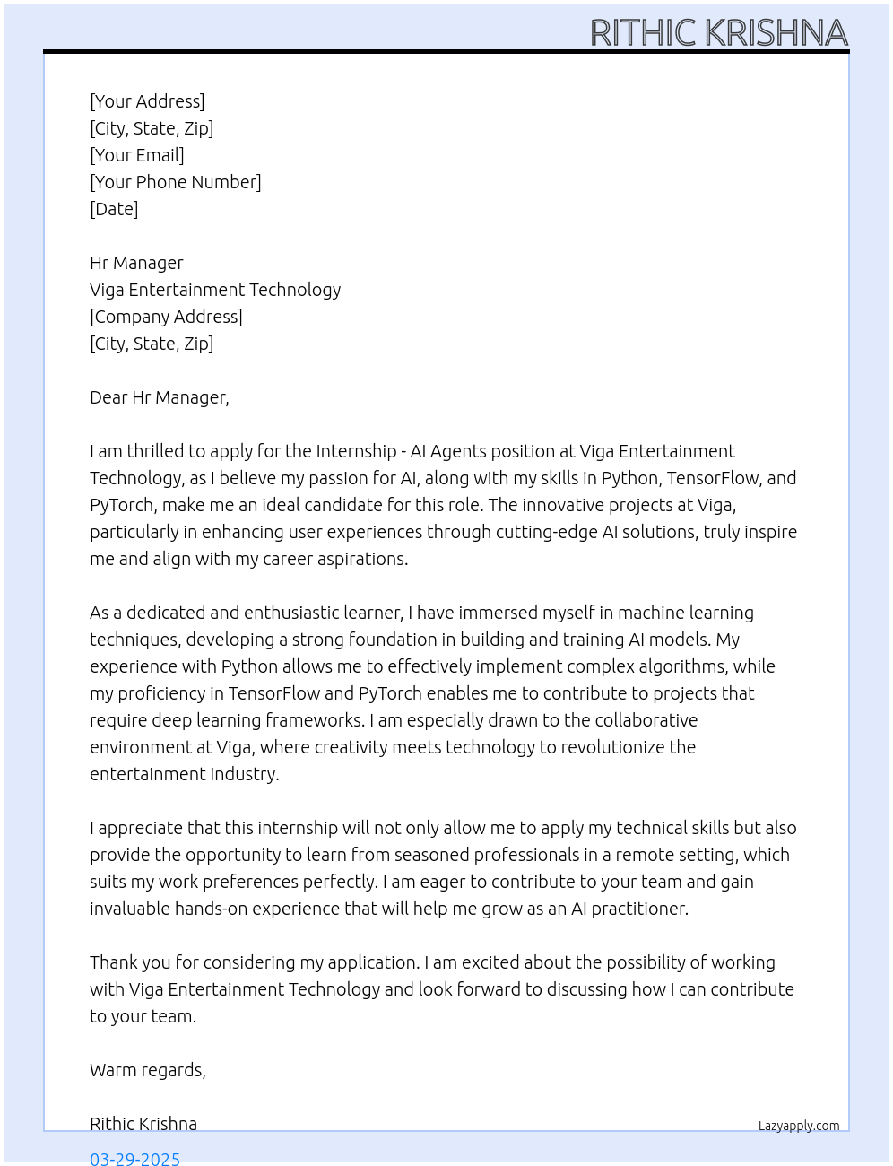 Internship -AI Agents Cover Letter At Viga Entertainment Technology