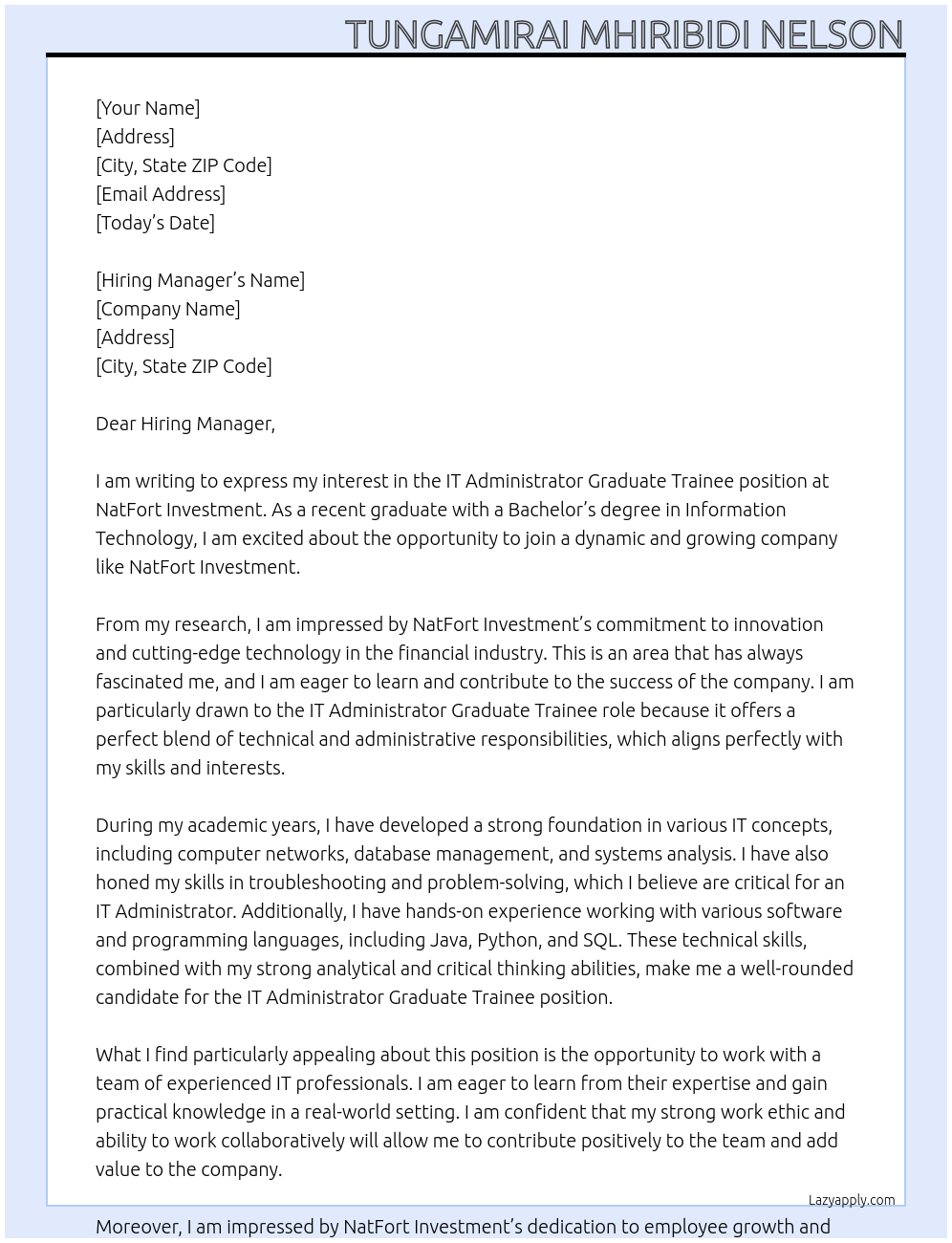 IT Administrator Graduate Trainee Cover Letter At NatFort Investment