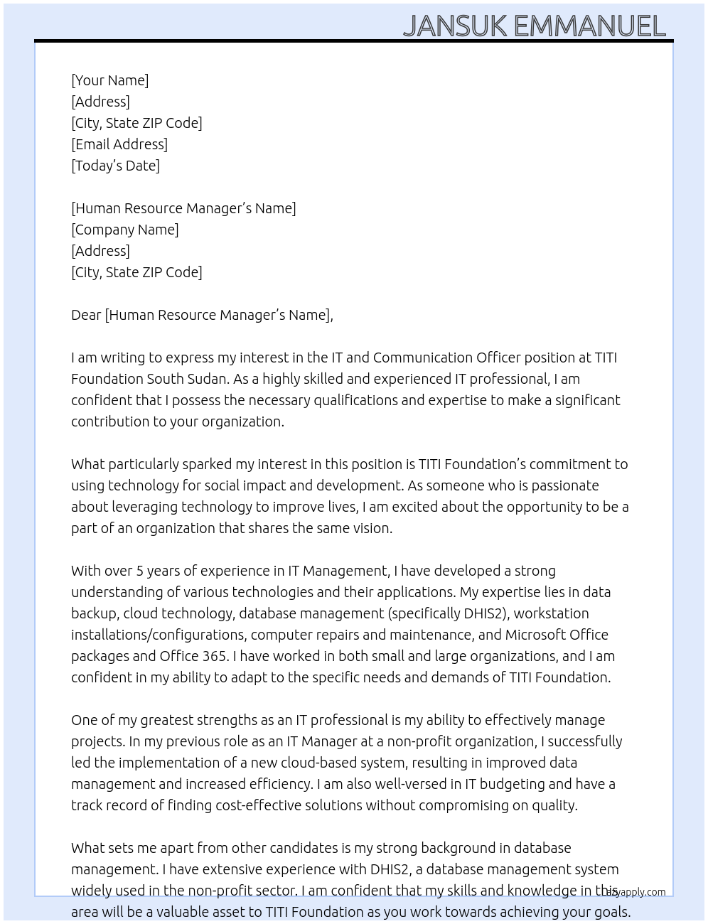 IT and Communication Officer Cover Letter At TITI Foundation South Sudan