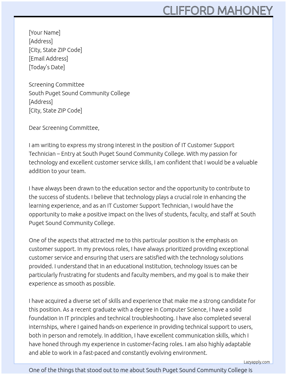IT Customer Support Technician - Entry Cover Letter At South Puget Sound Community College