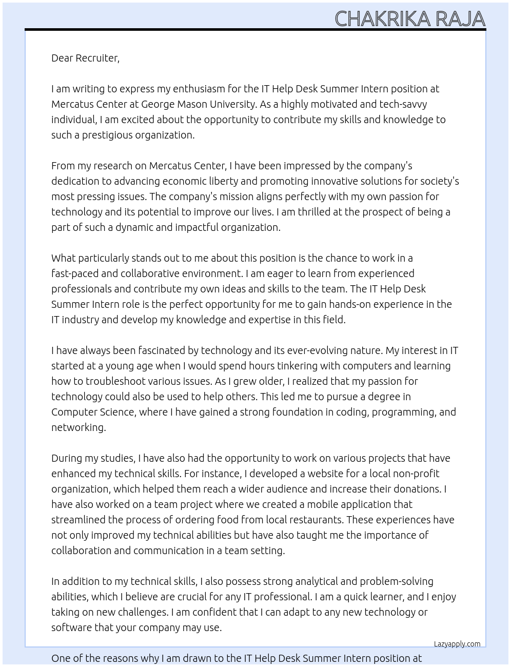 IT HELP DESK SUMMER INTERN Cover Letter At Mercatus Center at George Mason University