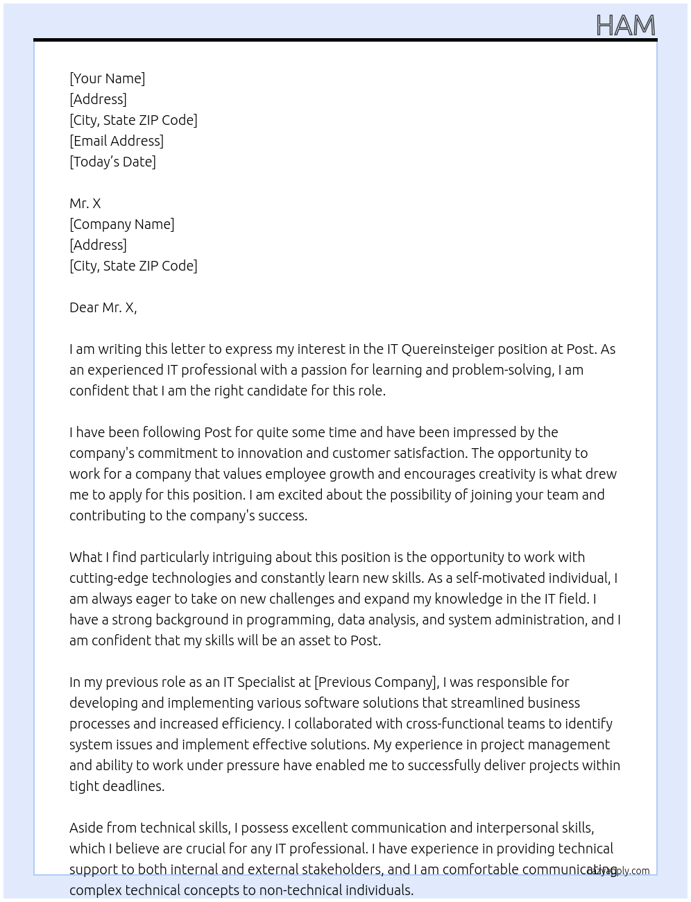 Check out these it quereinsteiger cover letter sample and examples previously used by job seekers to land on job interviews as it quereinsteiger. Use our AI cover letter generator to create a personalized cover letter as it quereinsteiger.