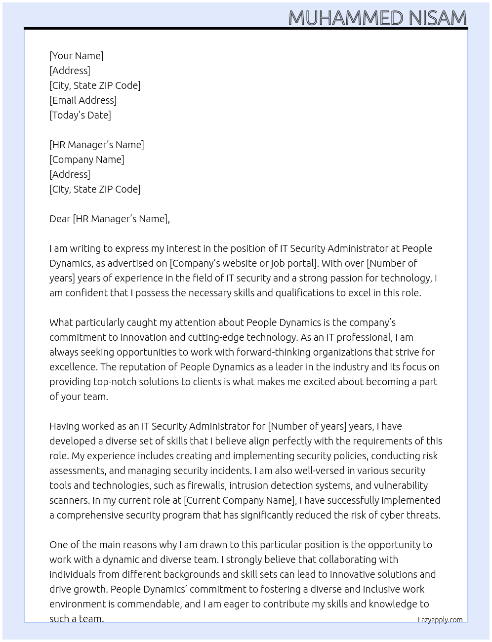 Check out these it security administrator cover letter sample and examples previously used by job seekers to land on job interviews as it security administrator. Use our AI cover letter generator to create a personalized cover letter as it security administrator.