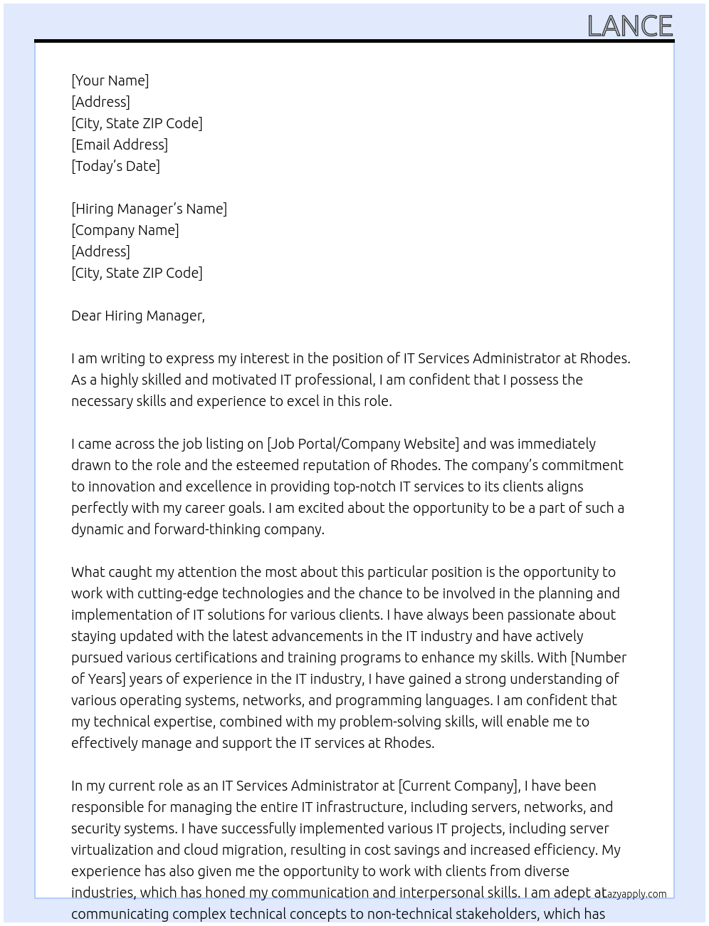 Check out these it services administrator cover letter sample and examples previously used by job seekers to land on job interviews as it services administrator. Use our AI cover letter generator to create a personalized cover letter as it services administrator.