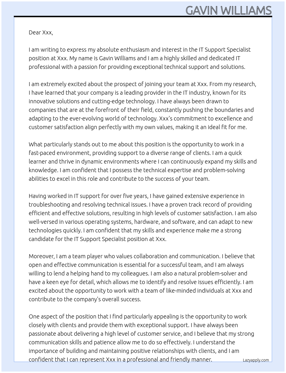 Check out these it support specalist cover letter sample and examples previously used by job seekers to land on job interviews as it support specalist. Use our AI cover letter generator to create a personalized cover letter as it support specalist.