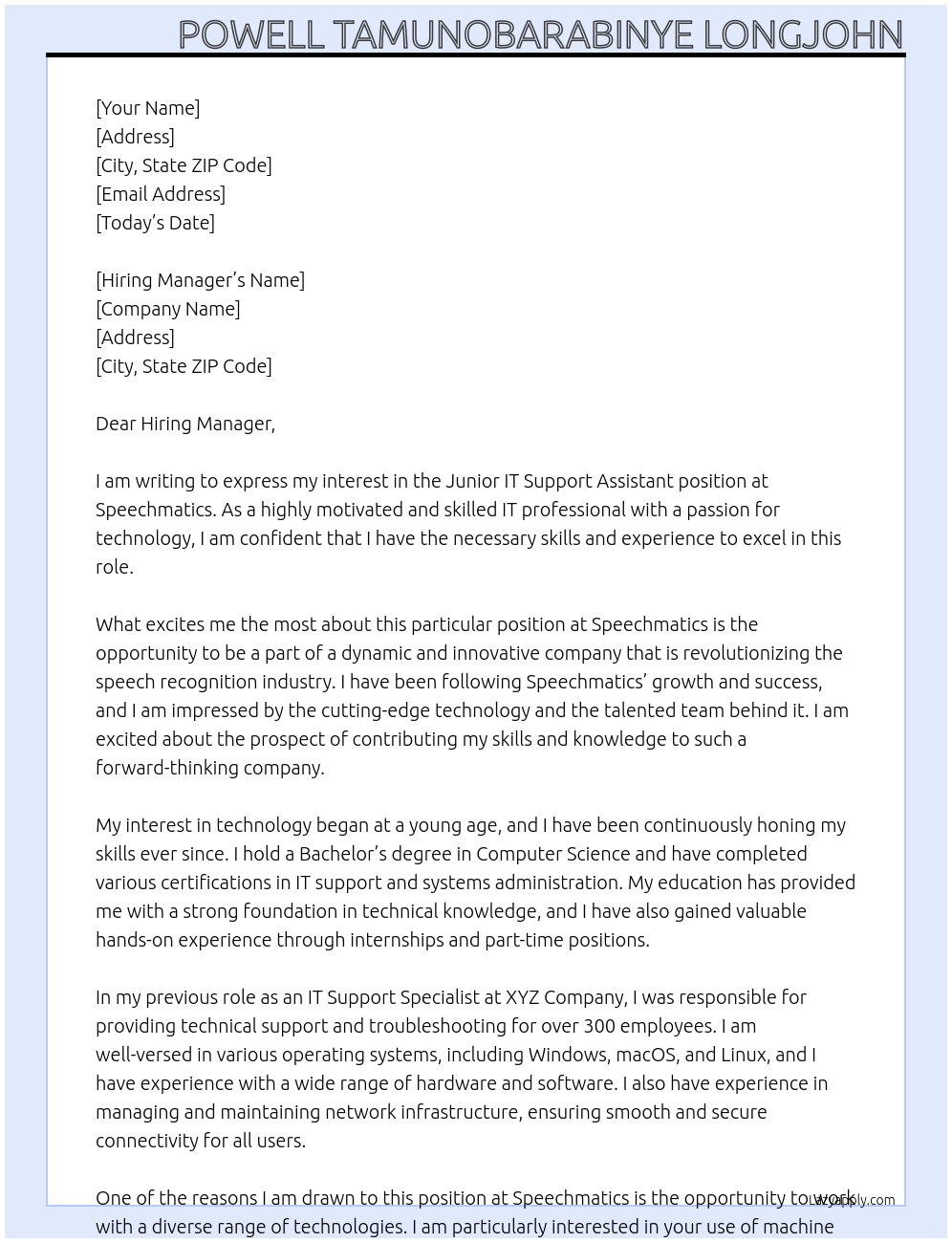 Junior IT Support Assitant Cover Letter At Speechmatics