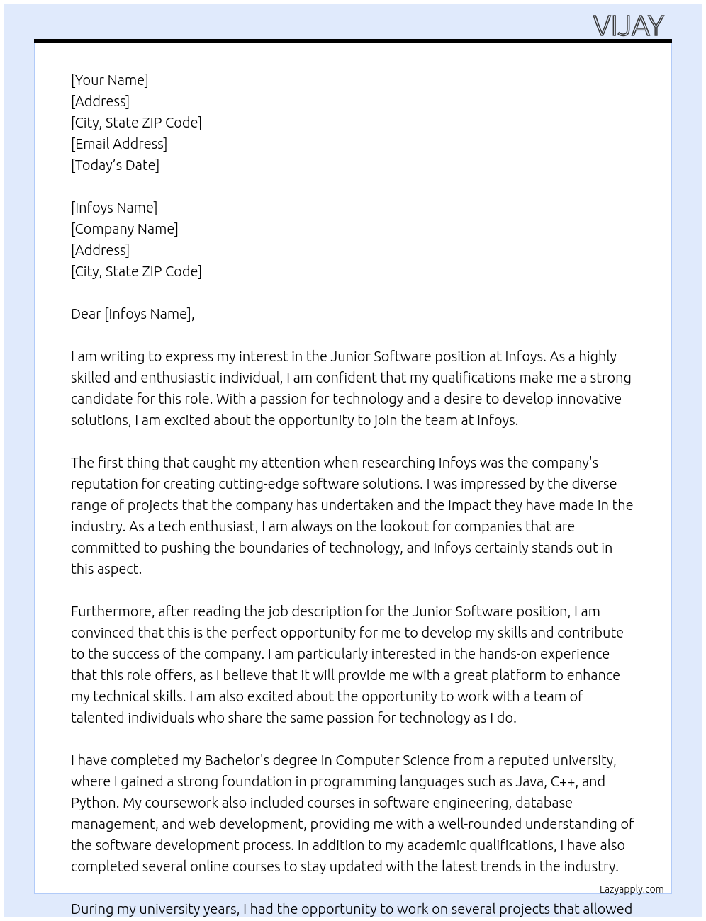 Check out these junior software cover letter sample and examples previously used by job seekers to land on job interviews as junior software. Use our AI cover letter generator to create a personalized cover letter as junior software.