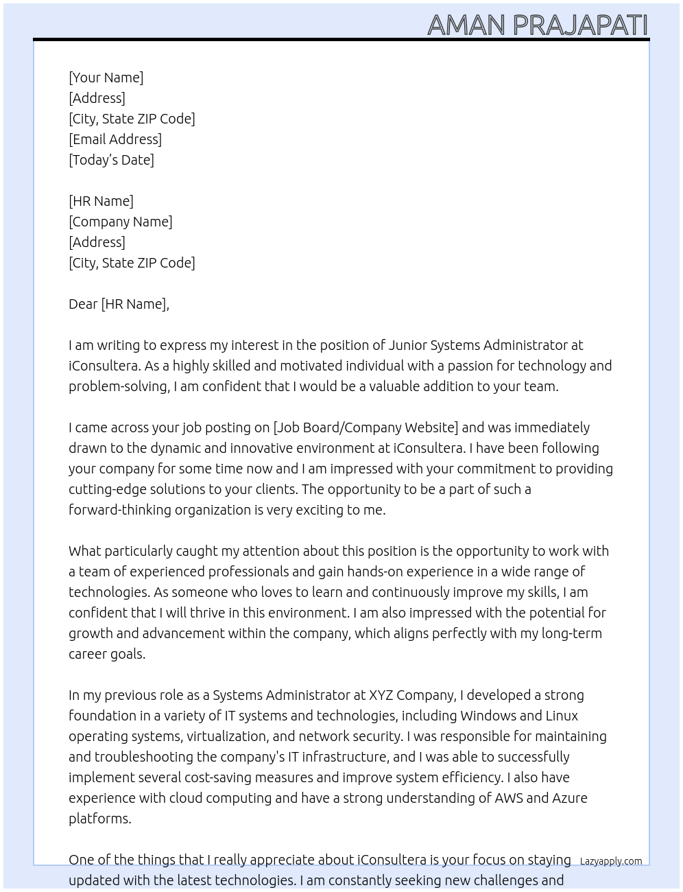 Check out these junior systems administrator cover letter sample and examples previously used by job seekers to land on job interviews as junior systems administrator. Use our AI cover letter generator to create a personalized cover letter as junior systems administrator.