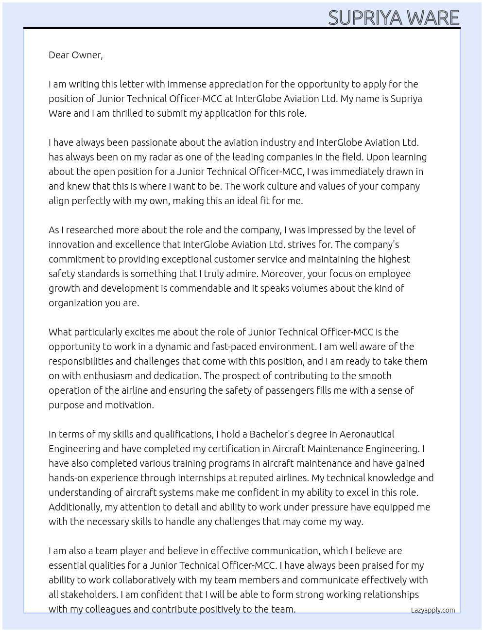 junior technical officer-mcc Cover Letter At interGlobe aviation Ltd.