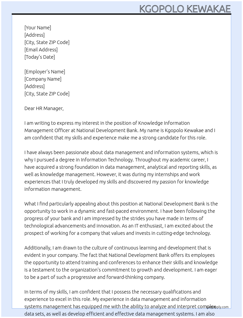 Knowledge Information Management officer Cover Letter At National Development Bank