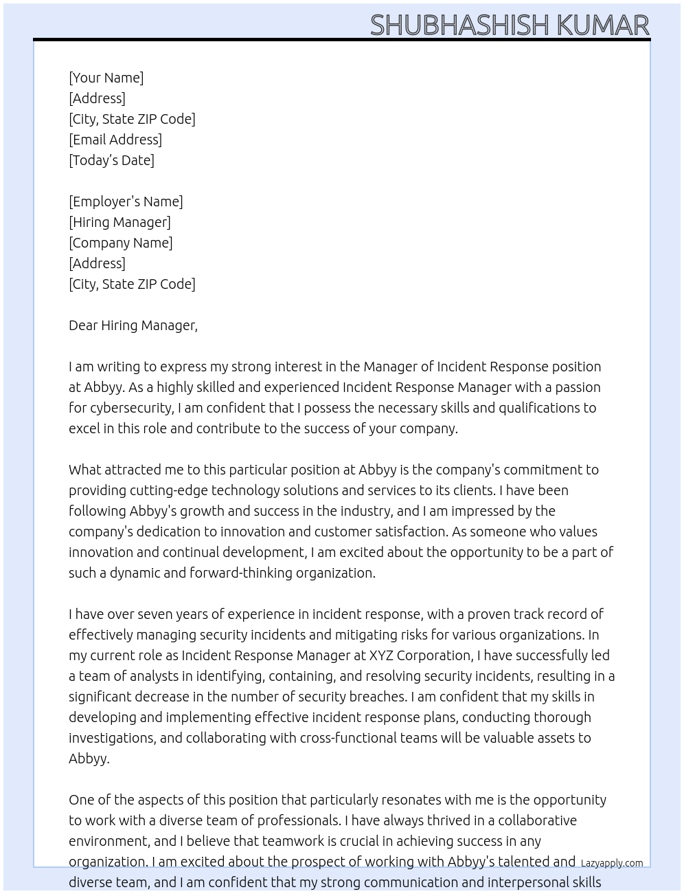 Manager of Incident Response Cover Letter At Abbyy