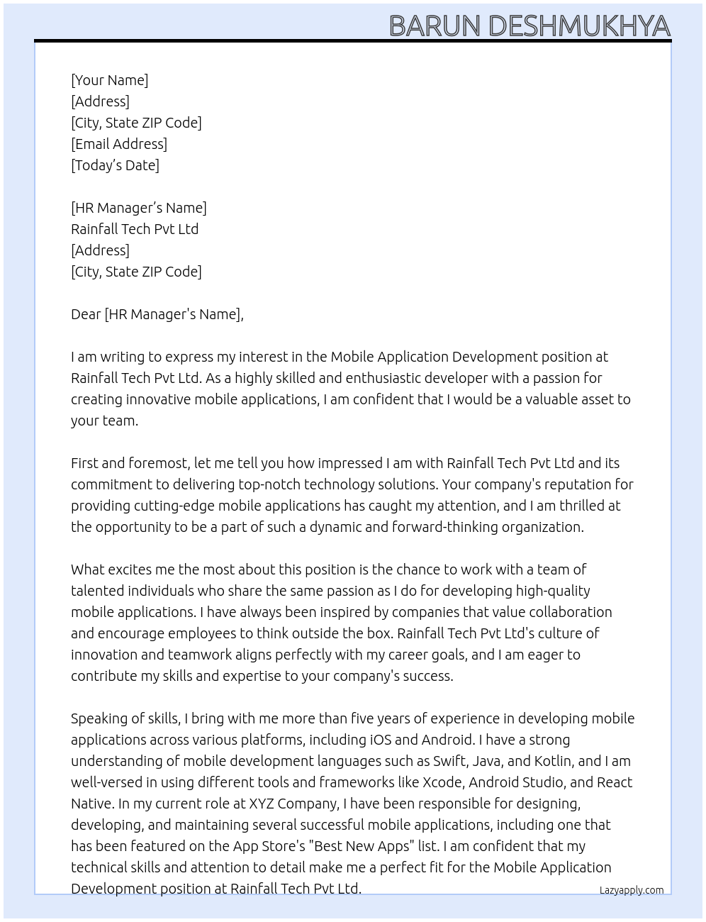 Mobile application development Cover Letter At Rainfall Tech pvt ltd