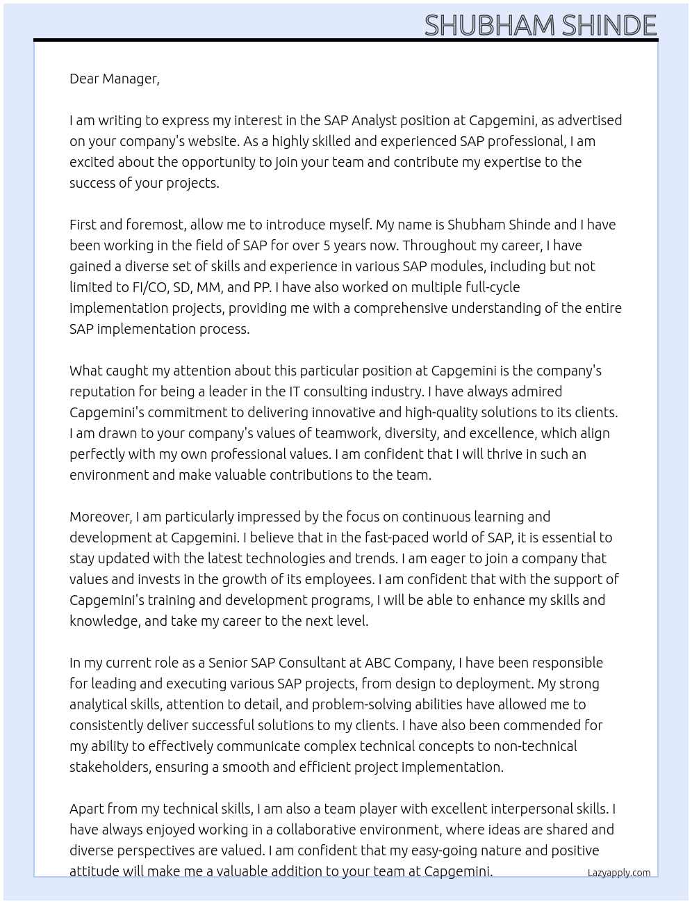 Check out these sap analyst cover letter sample and examples previously used by job seekers to land on job interviews as sap analyst. Use our AI cover letter generator to create a personalized cover letter as sap analyst.