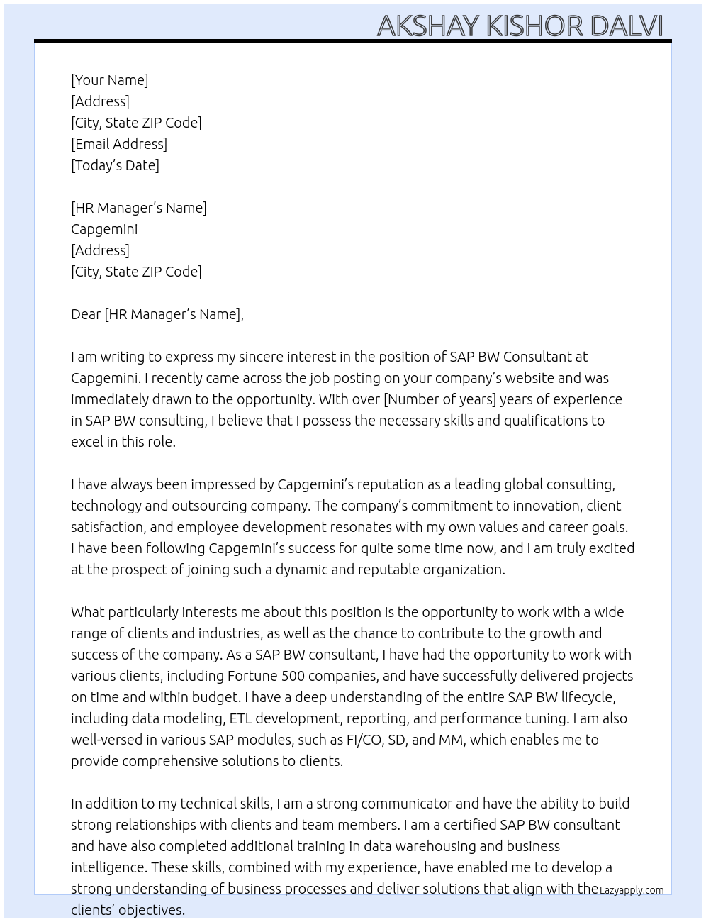 Check out these sap bw consulatant cover letter sample and examples previously used by job seekers to land on job interviews as sap bw consulatant. Use our AI cover letter generator to create a personalized cover letter as sap bw consulatant.