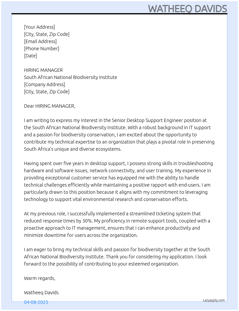 Senior Desktop Support Engineer Cover Letter At South African National Biodiversity Institute