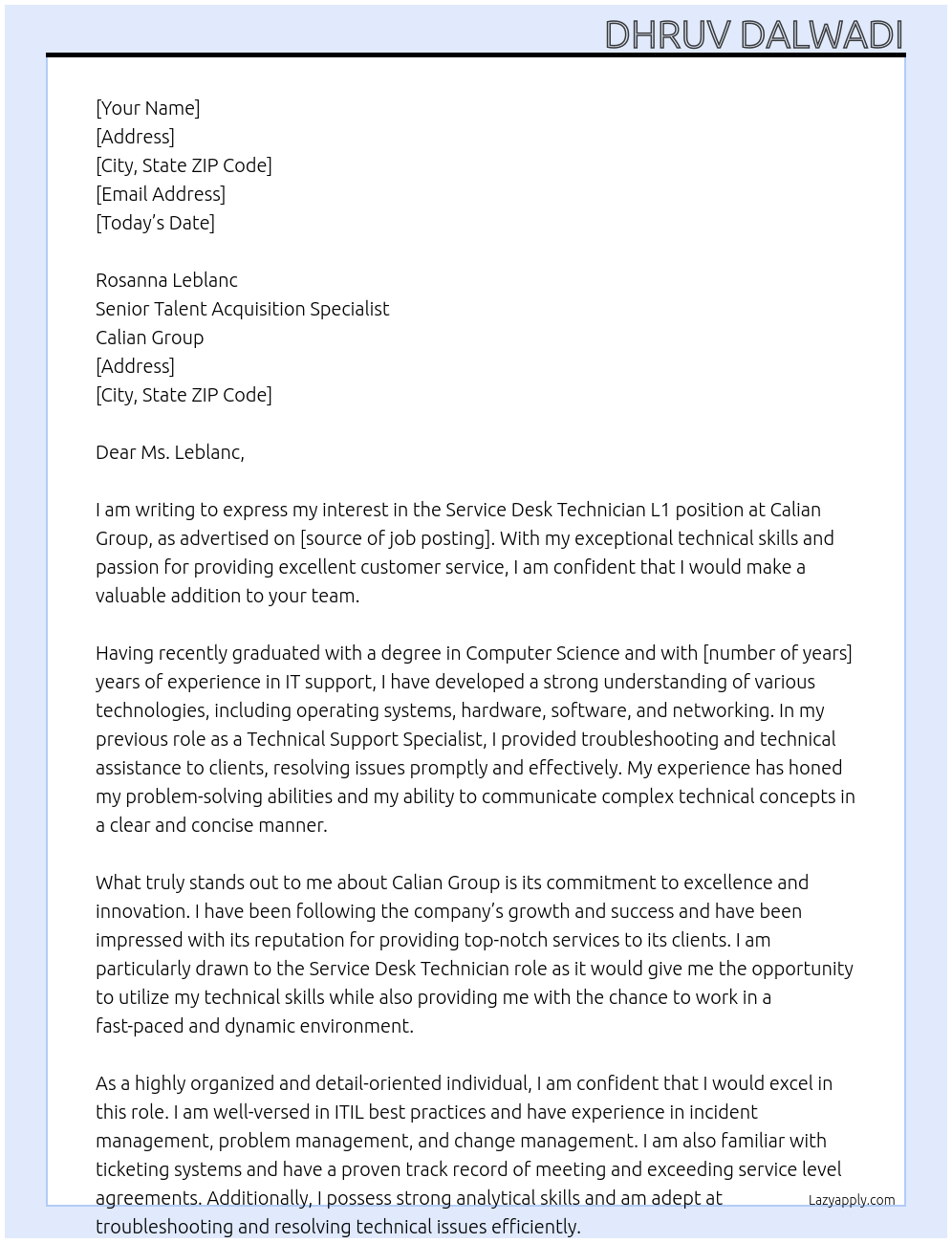 Check out these service desk technician l1 cover letter sample and examples previously used by job seekers to land on job interviews as service desk technician l1. Use our AI cover letter generator to create a personalized cover letter as service desk technician l1.