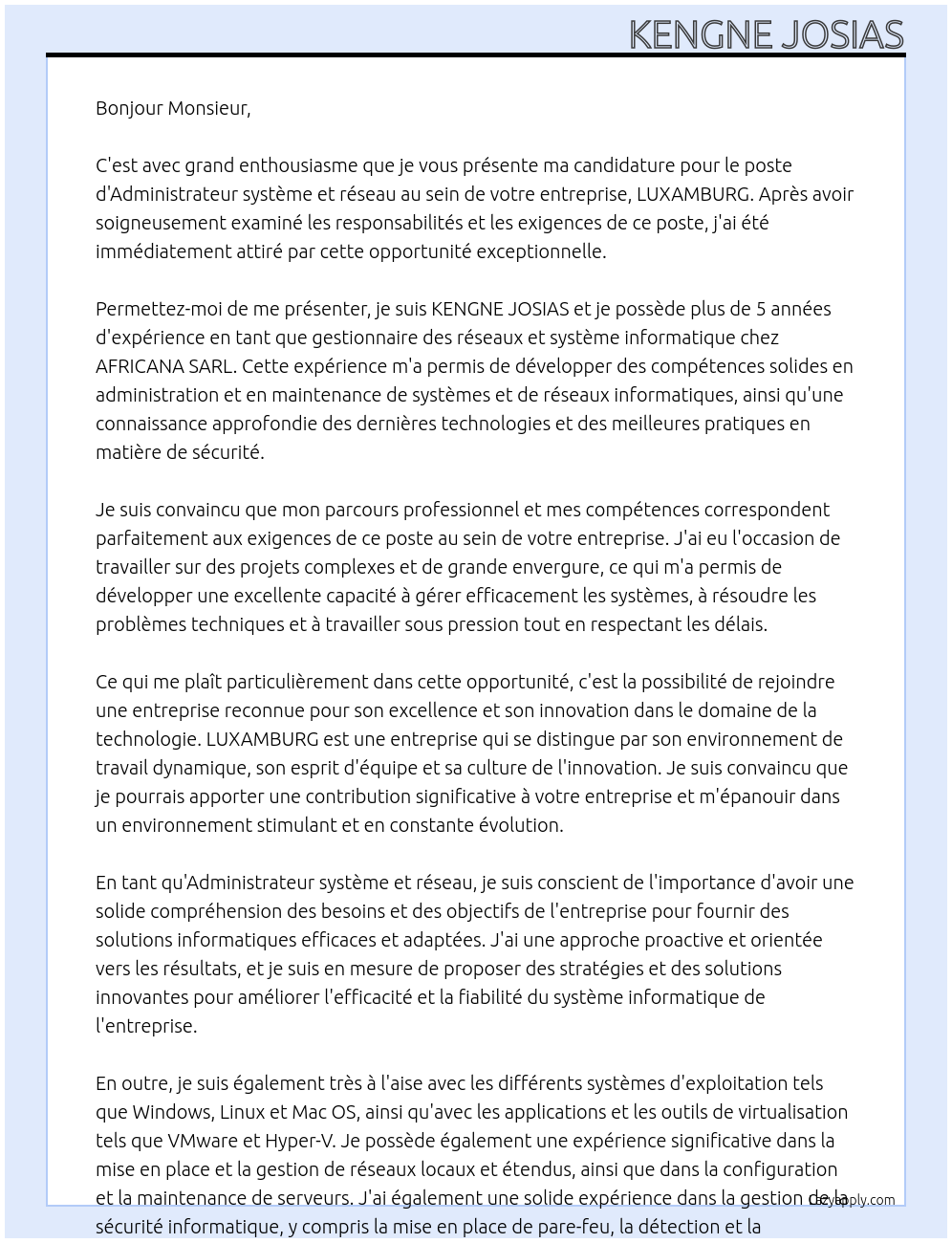 Check out these systeme administrator cover letter sample and examples previously used by job seekers to land on job interviews as systeme administrator. Use our AI cover letter generator to create a personalized cover letter as systeme administrator.