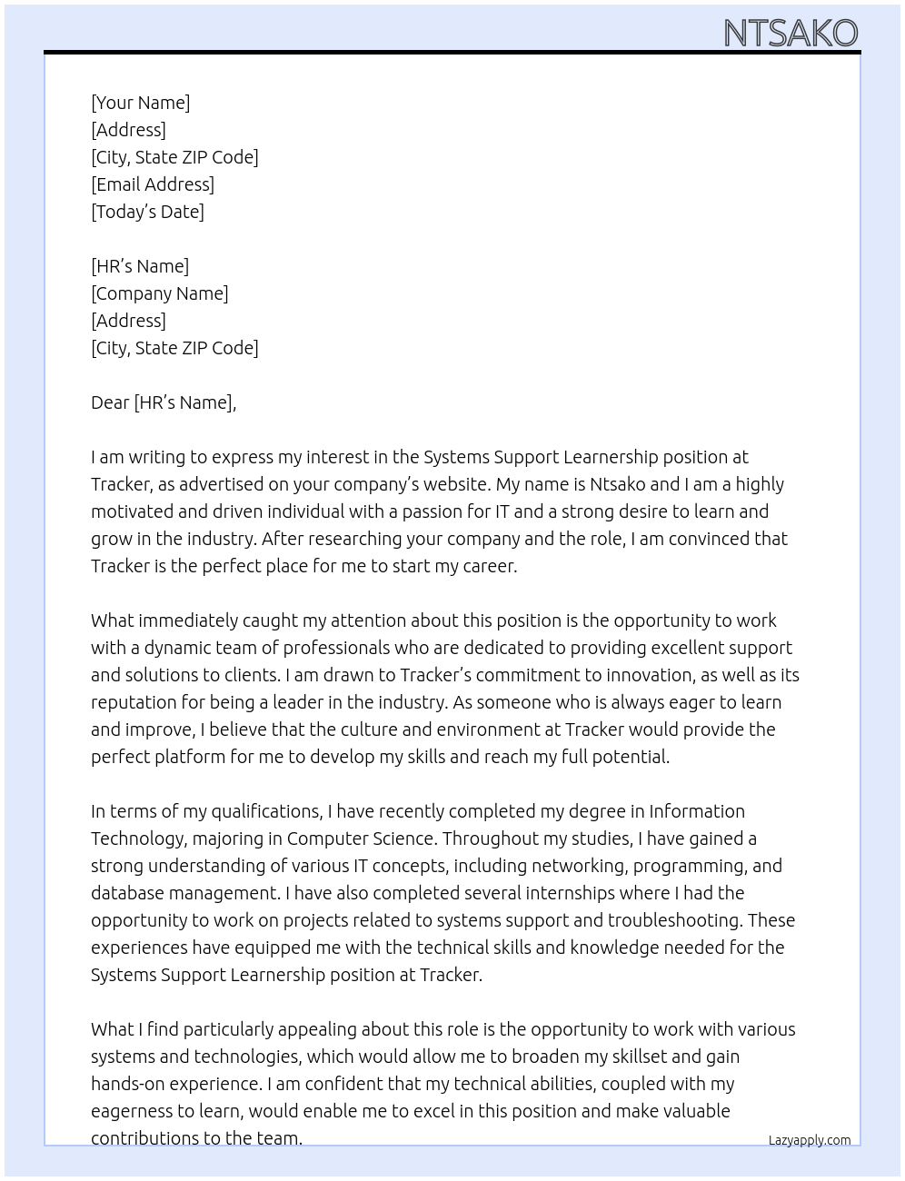 Systems support learnership Cover Letter At Tracker