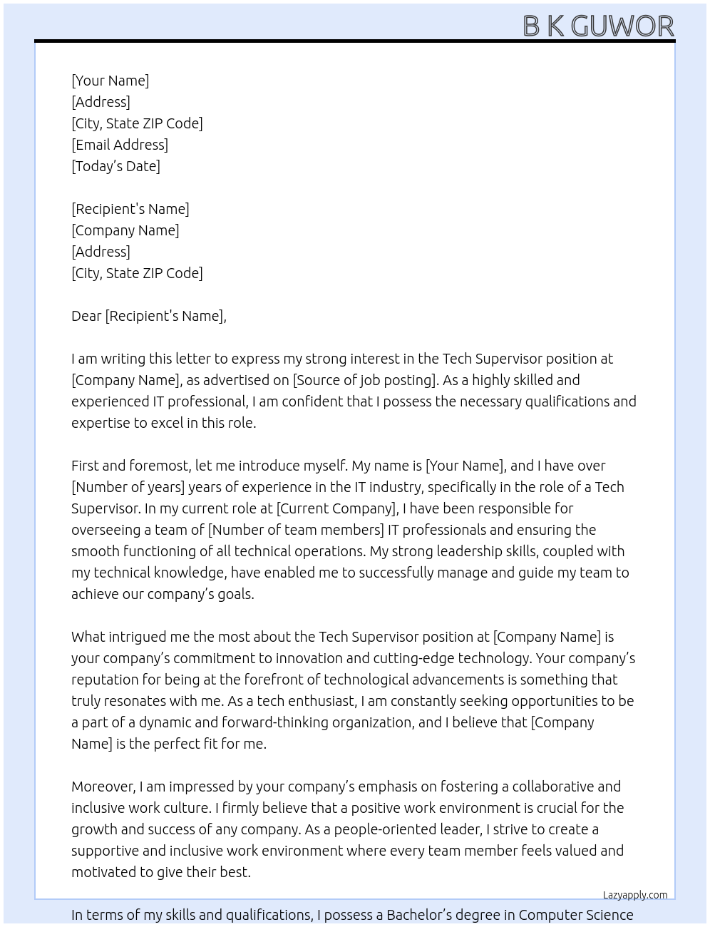 Check out these tech supervisor cover letter sample and examples previously used by job seekers to land on job interviews as tech supervisor. Use our AI cover letter generator to create a personalized cover letter as tech supervisor.