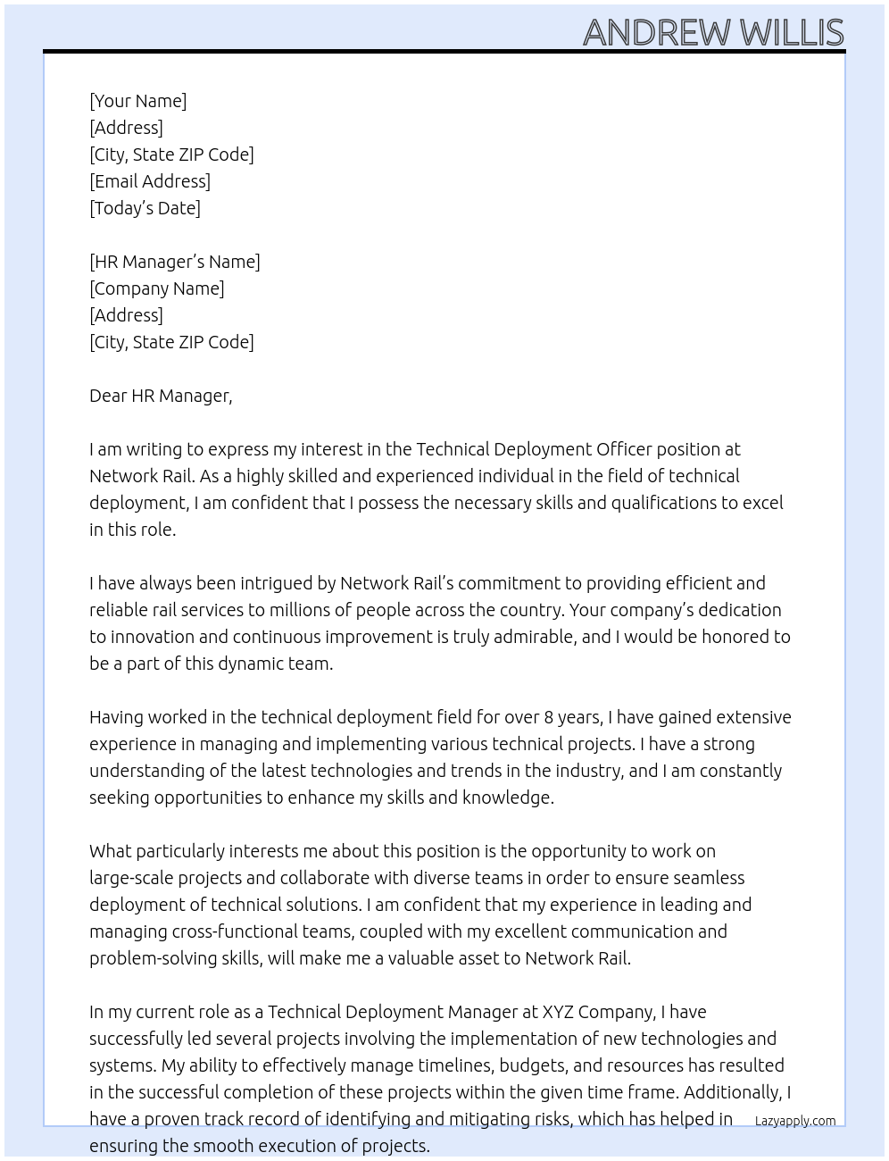 Check out these technical deployment officer cover letter sample and examples previously used by job seekers to land on job interviews as technical deployment officer. Use our AI cover letter generator to create a personalized cover letter as technical deployment officer.