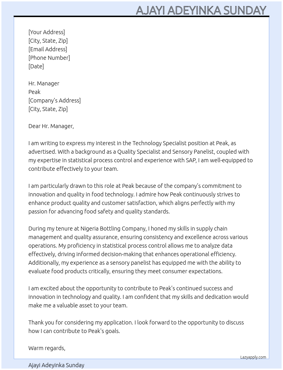 Check out these technology specialist cover letter sample and examples previously used by job seekers to land on job interviews as technology specialist. Use our AI cover letter generator to create a personalized cover letter as technology specialist.