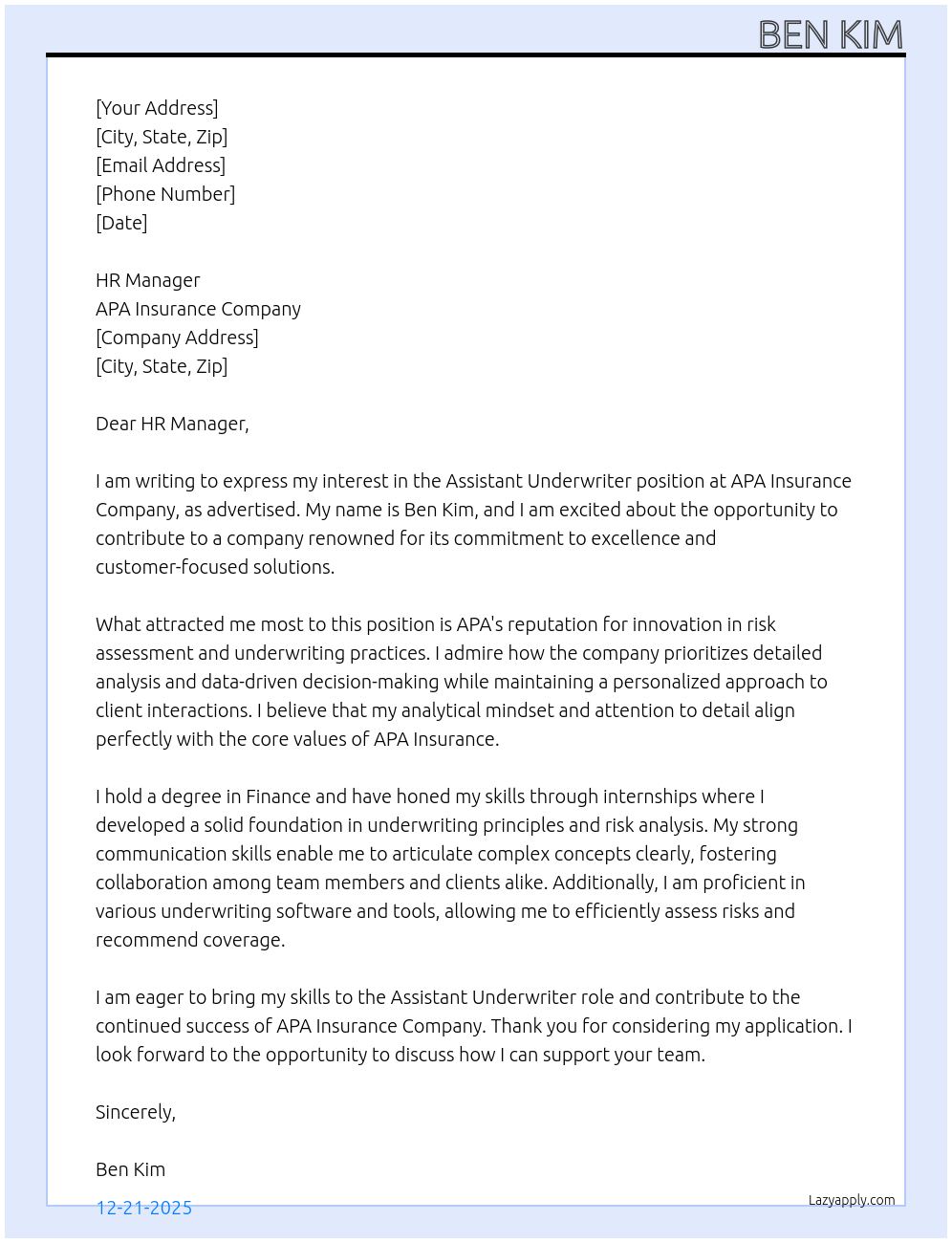 Assistant underwriter Cover Letter At APA INSURANCE COMPANY