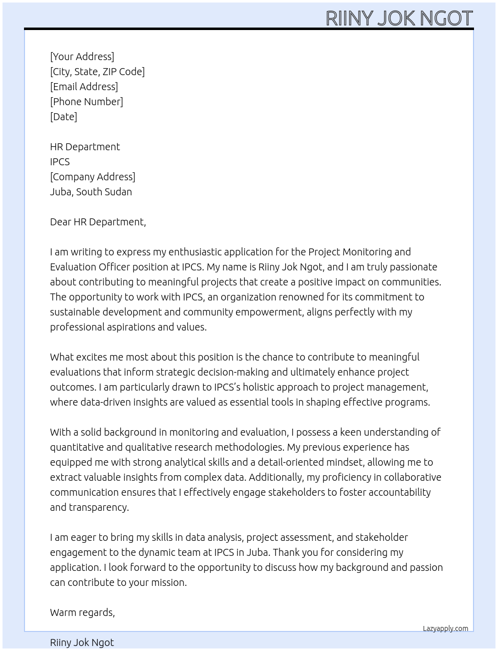 Project Monitoring and Evaluation officer Cover Letter At IPCS
