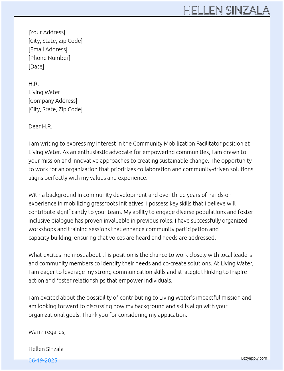 Community mobilization fasilitator Cover Letter At Living water