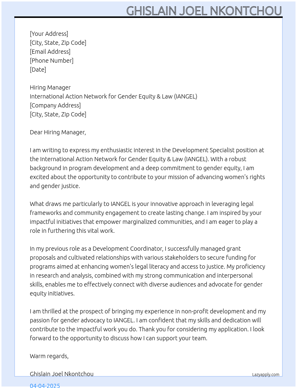 Development specialist Cover Letter At International Action Network for Gender Equity & Law (IANGEL)