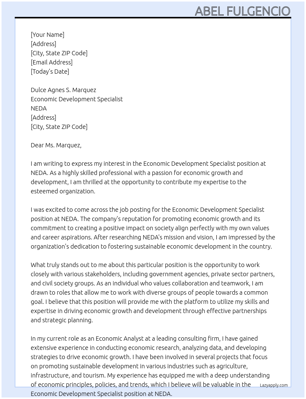 economic development specialist Cover Letter At national economic development authority