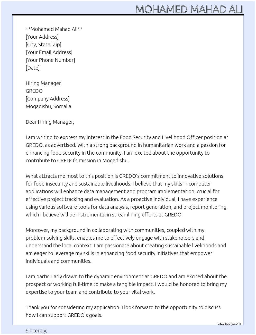 Check out these food security and livelihood cover letter sample and examples previously used by job seekers to land on job interviews as food security and livelihood. Use our AI cover letter generator to create a personalized cover letter as food security and livelihood.